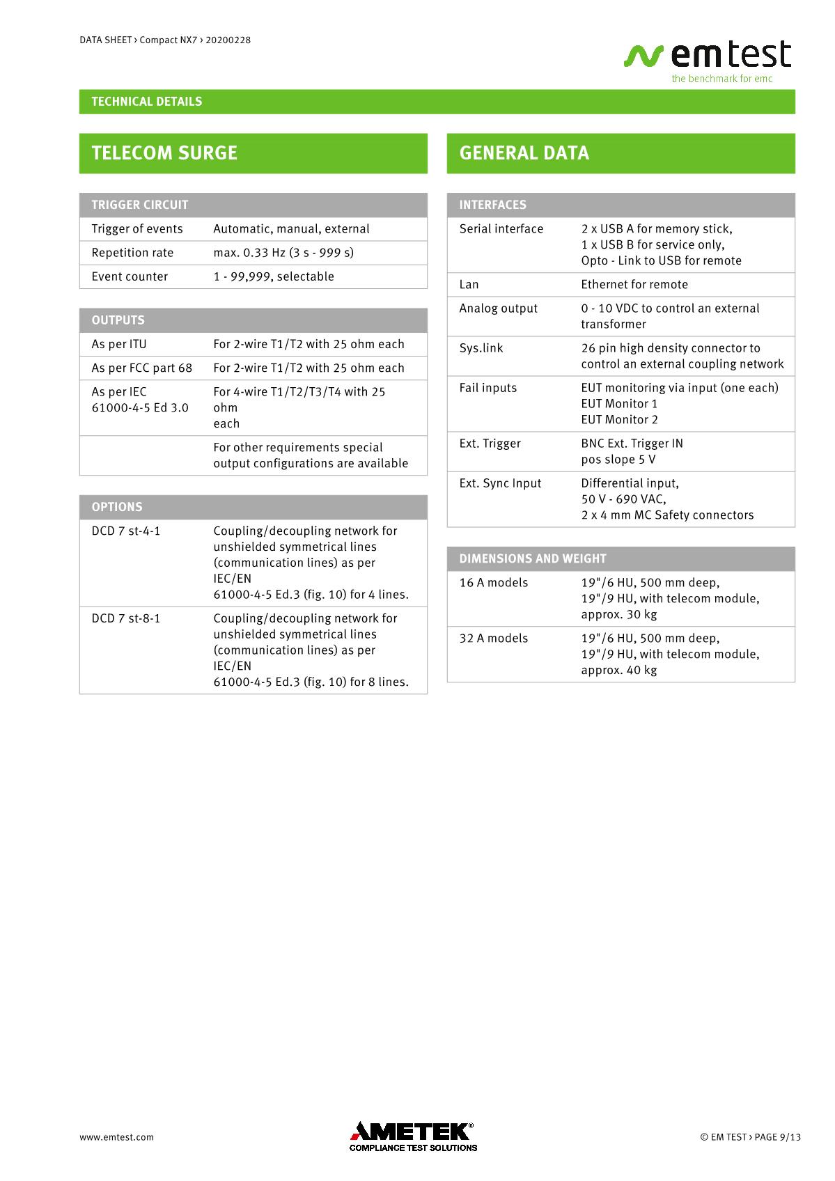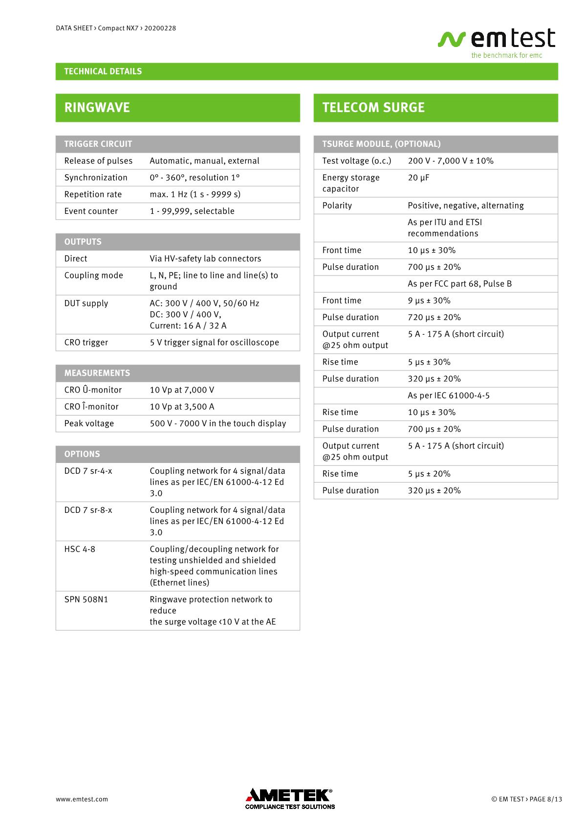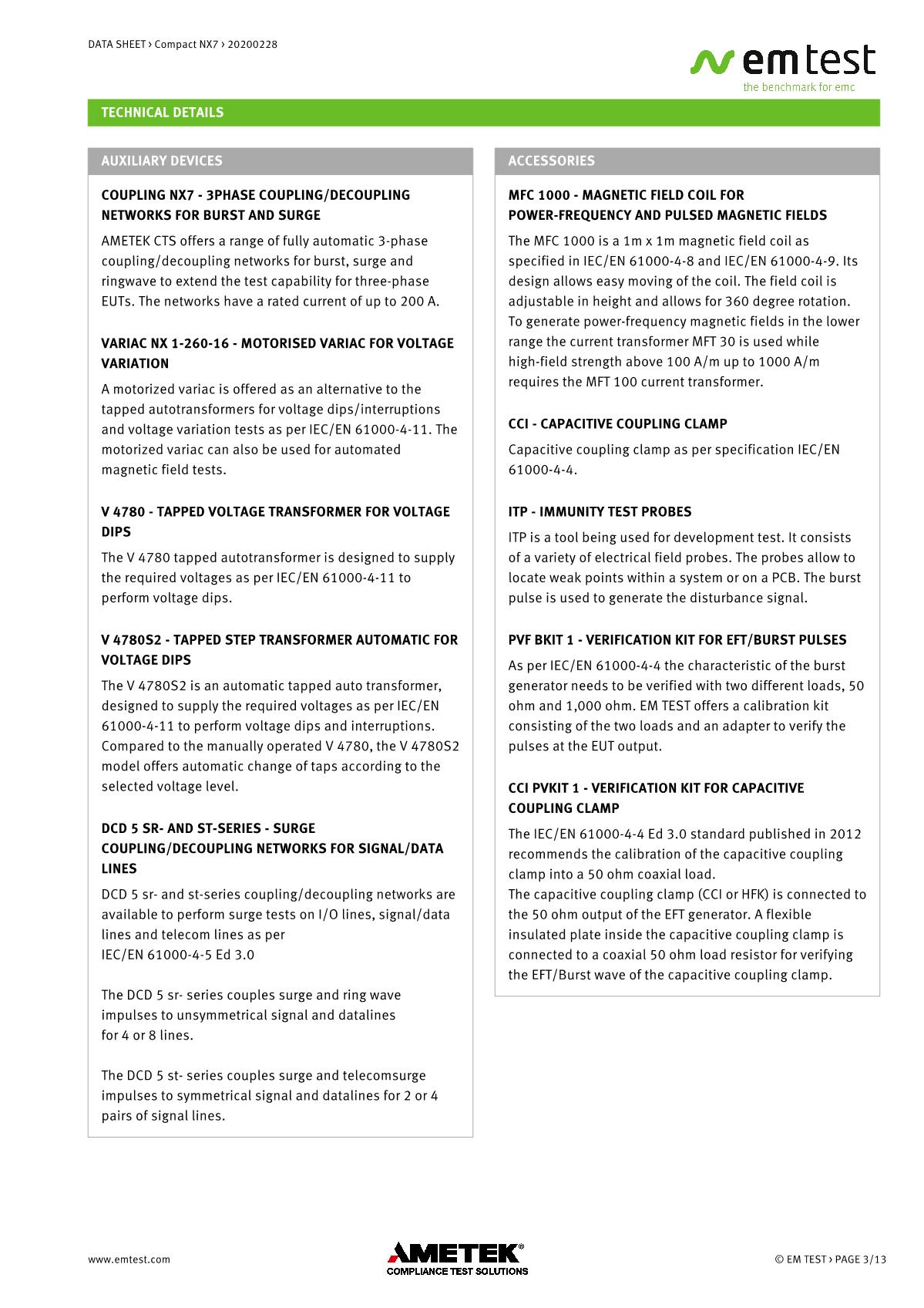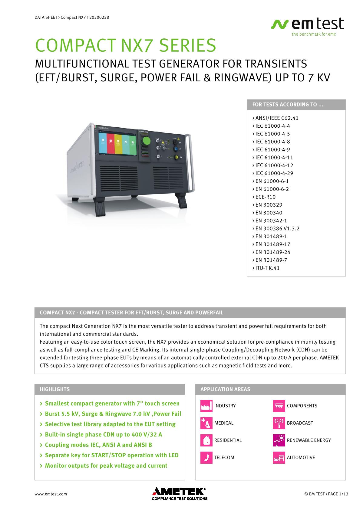 緊湊型下一代NX7是最通用的測試儀,品牌:EMTEST??蓾M足國際和商業(yè)標準的瞬態(tài)和電源故障要求。NX7采用易于使用的彩色觸摸屏,為預符合性抗擾度測試以及完全符合性測試和ce標志提供了經濟的解決方案。其內部單相耦合/去耦網絡(CDN)可通過每相高達200 A的自動控制外部CDN擴展至測試三相EUT。AMETEK CTS為磁場測試等各種應用提供大量附件。