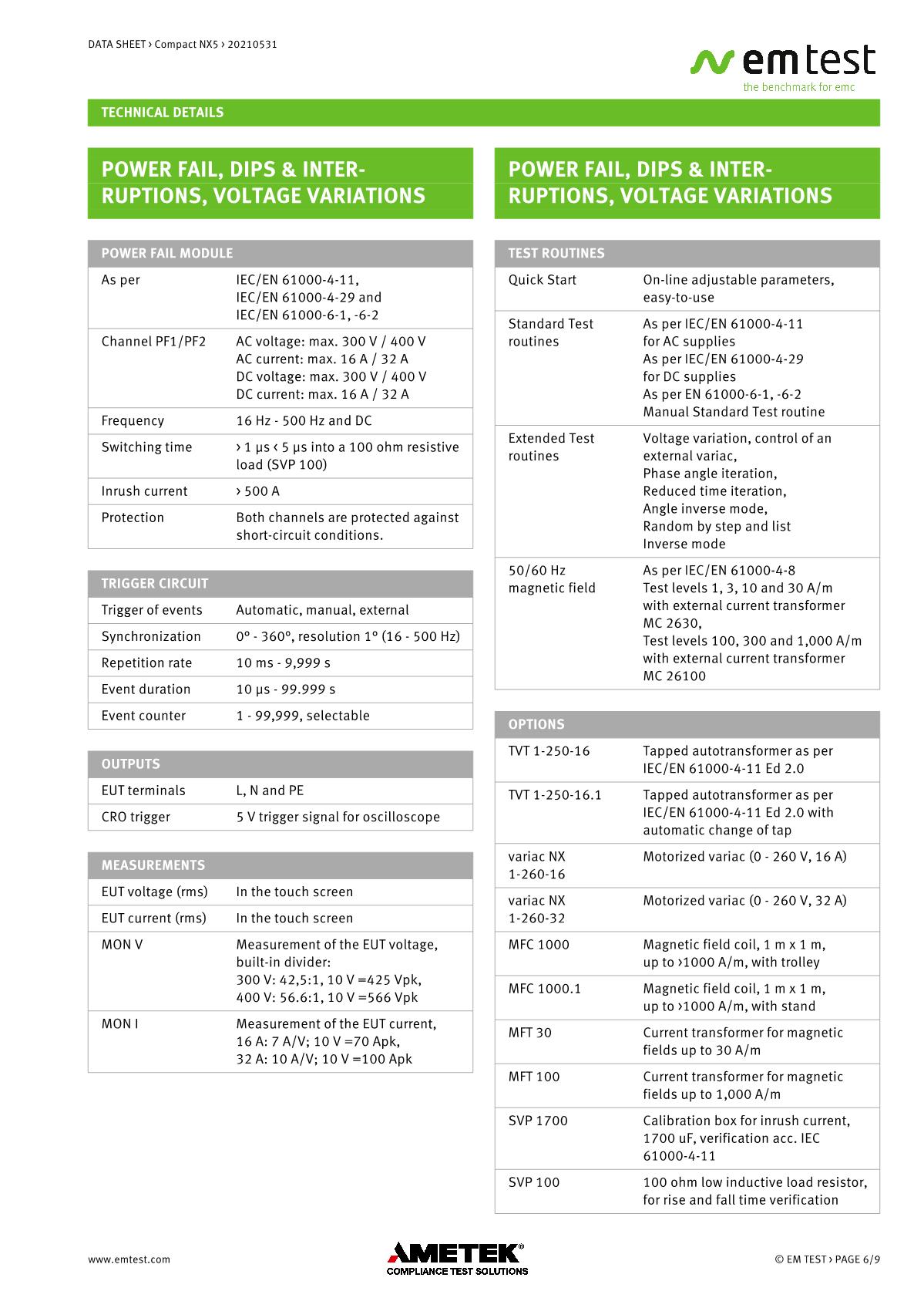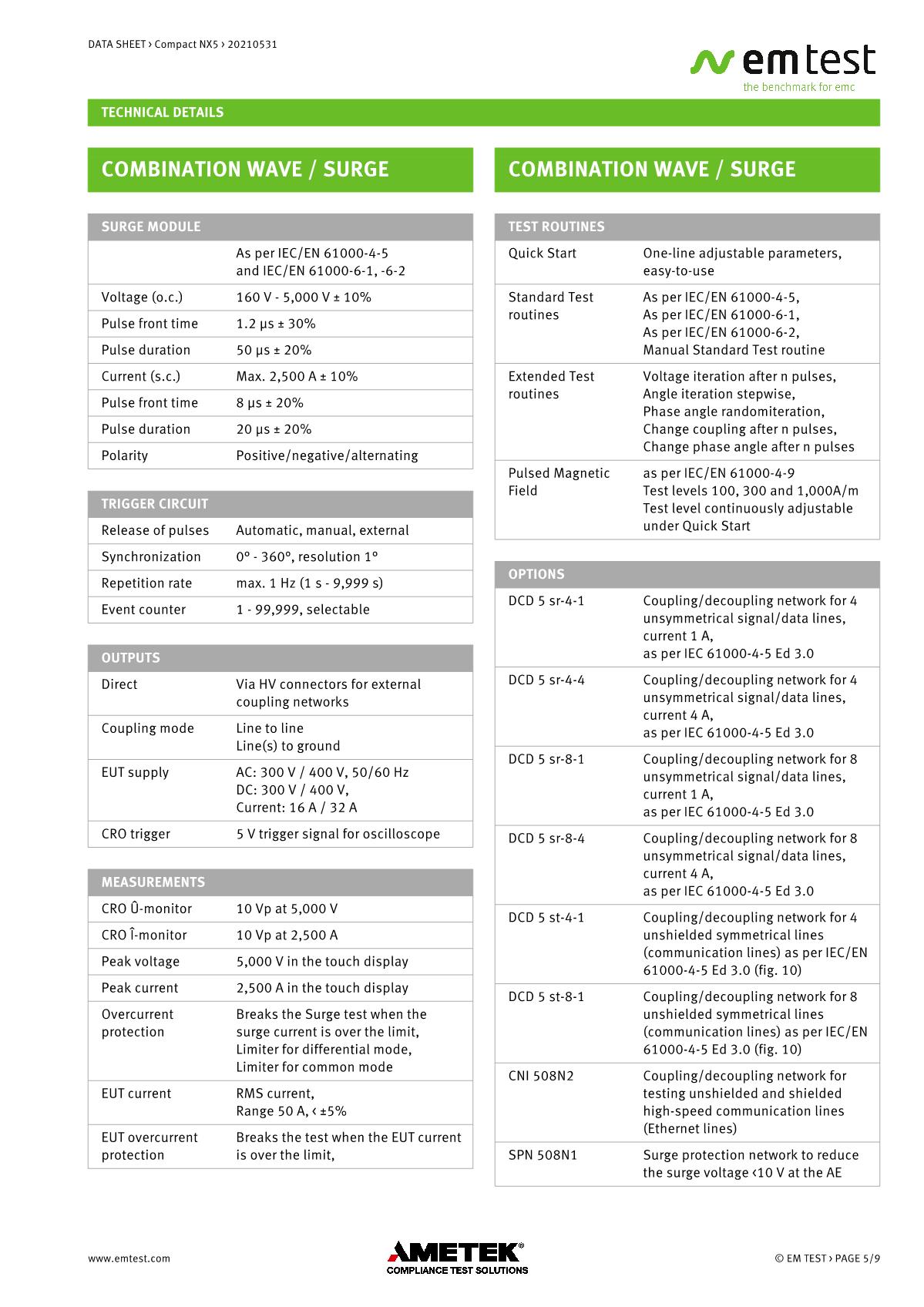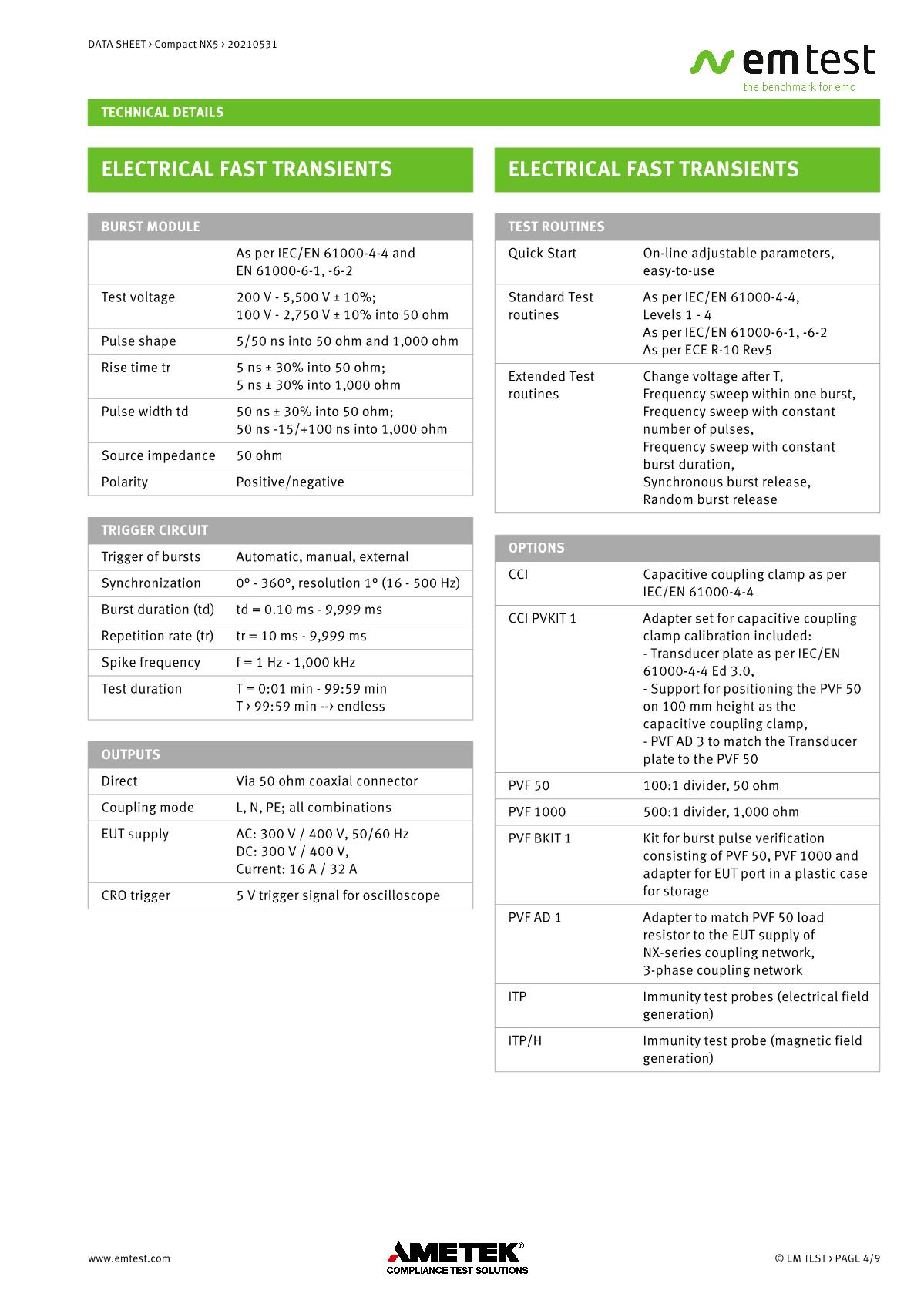 緊湊型NX5 ,品牌:EMTEST。用于EFT/Burst、浪涌和電源故障的緊湊型測試儀緊湊型新一代NX5是功能最全面的測試儀,可滿足國際和商業(yè)標(biāo)準(zhǔn)的瞬態(tài)和電源故障要求。NX5采用易于使用的彩色觸摸屏,為預(yù)符合性抗擾度測試以及完全符合性測試和ce標(biāo)志提供了經(jīng)濟的解決方案。其內(nèi)部單相耦合/去耦網(wǎng)絡(luò)(CDN)可通過每相高達200 A的自動控制外部CDN擴展至測試三相EUT。EM TEST為磁場測試等各種應(yīng)用提供大量附件。
