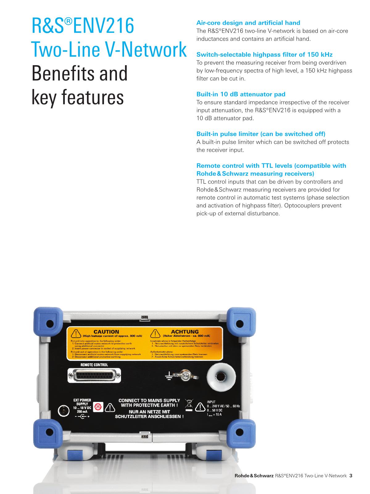 R&S?ENV216 二線制 V 形網(wǎng)絡(luò)滿足 CISPR 16-1-2 和 EN 55016-1-2 中有關(guān) V 形網(wǎng)絡(luò)的要求,在 9 kHz 至 30 MHz 的頻率范圍內(nèi),模擬阻抗為 (50 μH + 5 Ω) || 50 Ω;并滿足 ANSI C63.4 相關(guān)要求,頻率范圍為 150 kHz 至 30 MHz。具有接地保護觸點的插座可連接至被測設(shè)備。多款符合國家/地區(qū)特定連接器系統(tǒng)的型號可供選擇。得益于緊湊輕量化設(shè)計,R&S?ENV216 非常適用于變頻應(yīng)用,尤其是單相被測設(shè)備的現(xiàn)場